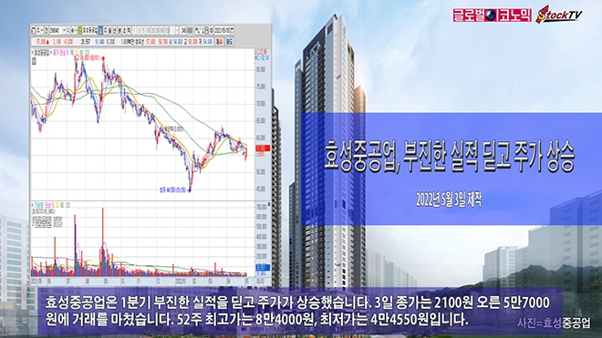 효성중공업은 1분기 부진한 실적을 딛고 주가가 상승했습니다. 3일 종가는 2100원 오른 5만7000원에 거래를 마쳤습니다. 52주 최고가는 8만4000원, 최저가는 4만4550원입니다.