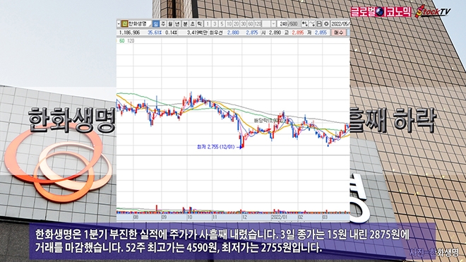 한화생명은 1분기 부진한 실적에 주가가 사흘째 내렸습니다. 3일 종가는 15원 내린 2875원에 거래를 마감했습니다. 52주 최고가는 4590원, 최저가는 2755원입니다.