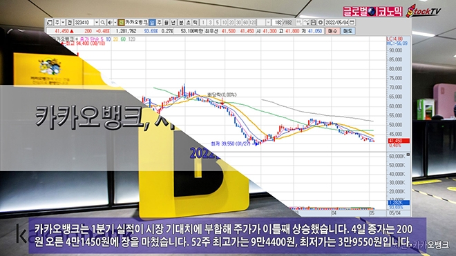 카카오뱅크는 1분기 실적이 시장 기대치에 부합해 주가가 이틀째 상승했습니다. 4일 종가는 200원 오른 4만1450원에 장을 마쳤습니다. 52주 최고가는 9만4400원, 최저가는 3만9550원입니다.