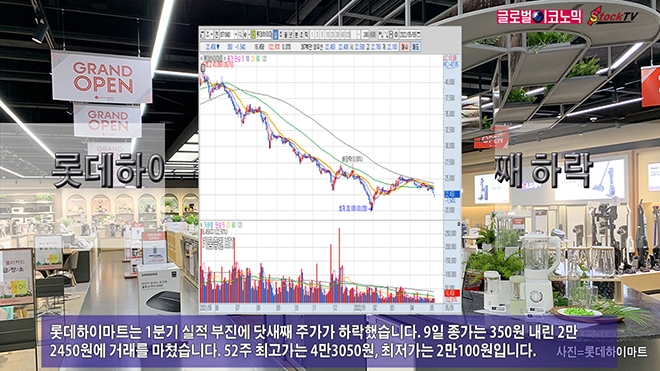 롯데하이마트는 1분기 실적 부진에 닷새째 주가가 하락했습니다. 9일 종가는 350원 내린 2만2450원에 거래를 마쳤습니다. 52주 최고가는 4만3050원, 최저가는 2만100원입니다.