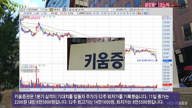 키움증권은 1분기 실적이 기대치를 밑돌자 주가가 52주 최저가를 기록했습니다. 11일 종가는 2200원 내린 8만5800원입니다. 52주 최고가는 14만1000원, 최저가는 8만5500원입니다.