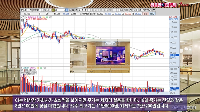 CJ는 비상장 자회사가 호실적을 보이지만 주가는 제자리 걸음을 합니다. 18일 종가는 전일과 같은 8만3100원에 장을 마쳤습니다. 52주 최고가는 11만8000원, 최저가는 7만5200원입니다.