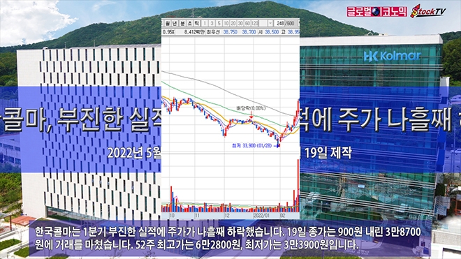 한국콜마는 1분기 부진한 실적에 주가가 나흘째 하락했습니다. 19일 종가는 900원 내린 3만8700원에 거래를 마쳤습니다. 52주 최고가는 6만2800원, 최저가는 3만3900원입니다.