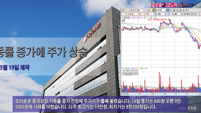 오리온은 중국공장 가동률 증가 전망에 주가가 이틀째 올랐습니다. 19일 종가는 800원 오른 9만5000원에 거래를 마쳤습니다. 52주 최고가는 13만원, 최저가는 8만200원입니다.
