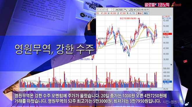 영원무역은 강한 수주 모멘텀에 주가가 올랐습니다. 20일 종가는 1000원 오른 4만7250원에 거래를 마쳤습니다. 영원무역의 52주 최고가는 5만3000원, 최저가는 3만7950원입니다.