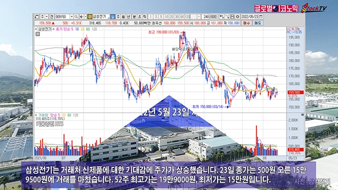 삼성전기는 거래처 신제품에 대한 기대감에 주가가 상승했습니다. 23일 종가는 500원 오른 15만9500원에 거래를 마쳤습니다. 52주 최고가는 19만9000원, 최저가는 15만원입니다.