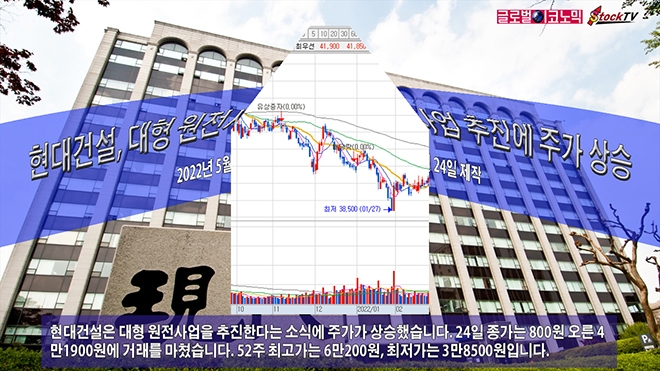 현대건설은 대형 원전사업을 추진한다는 소식에 주가가 상승했습니다. 24일 종가는 800원 오른 4만1900원에 거래를 마쳤습니다. 52주 최고가는 6만200원, 최저가는 3만8500원입니다.