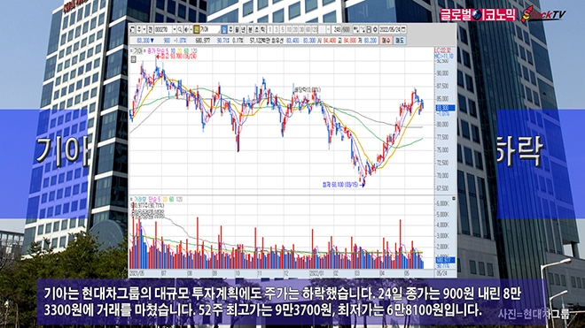 기아는 현대차그룹의 대규모 투자계획에도 주가는 하락했습니다. 24일 종가는 900원 내린 8만3300원에 거래를 마쳤습니다. 52주 최고가는 9만3700원, 최저가는 6만8100원입니다.