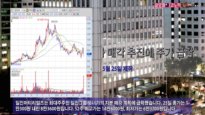 일진머티리얼즈는 최대주주인 일진그룹 오너가의 지분 매각 계획에 급락했습니다. 25일 종가는 1만300원 내린 8만3600원입니다. 52주 최고가는 14만8000원, 최저가는 6만3700원입니다.