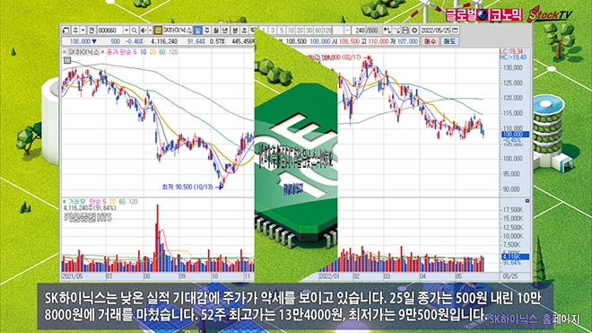 SK하이닉스는 낮은 실적 기대감에 주가가 약세를 보이고 있습니다. 25일 종가는 500원 내린 10만8000원에 거래를 마쳤습니다. 52주 최고가는 13만4000원, 최저가는 9만500원입니다.