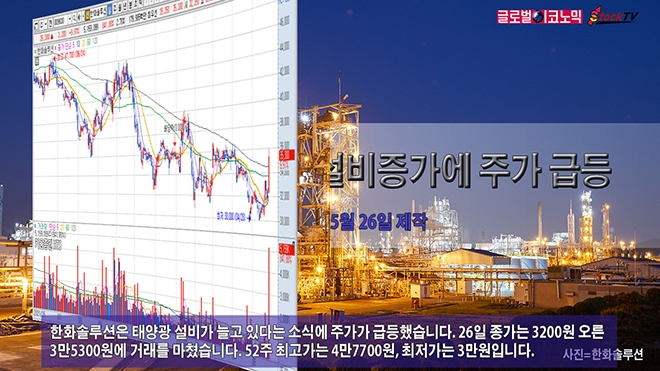 한화솔루션은 태양광 설비가 늘고 있다는 소식에 주가가 급등했습니다. 26일 종가는 3200원 오른 3만5300원에 거래를 마쳤습니다. 52주 최고가는 4만7700원, 최저가는 3만원입니다.