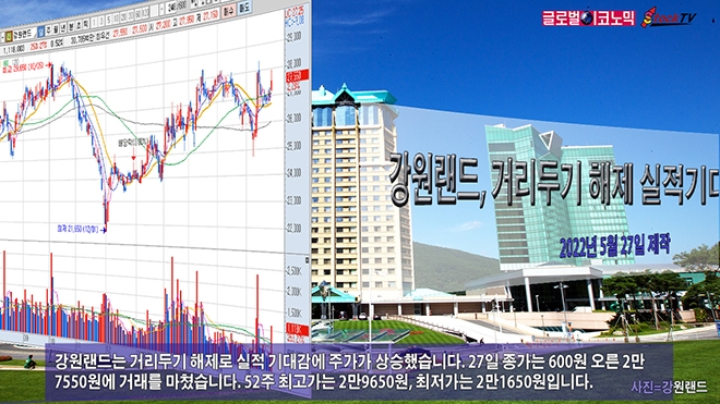 강원랜드는 거리두기 해제로 실적 기대감에 주가가 상승했습니다. 27일 종가는 600원 오른 2만7550원에 거래를 마쳤습니다. 52주 최고가는 2만9650원, 최저가는 2만1650원입니다.