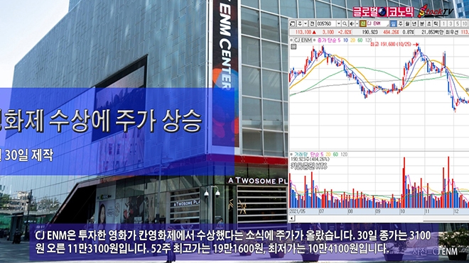 CJ ENM은 투자한 영화가 칸영화제에서 수상했다는 소식에 주가가 올랐습니다. 30일 종가는 3100원 오른 11만3100원입니다. 52주 최고가는 19만1600원, 최저가는 10만4100원입니다.