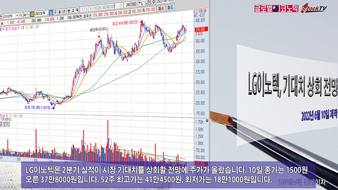 LG이노텍은 2분기 실적이 시장 기대치를 상회할 전망에 주가가 올랐습니다. 10일 종가는 1500원 오른 37만8000원입니다. 52주 최고가는 41만4500원, 최저가는 18만1000원입니다.
