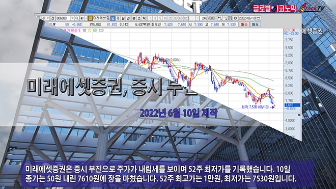 미래에셋증권은 증시 부진으로 주가가 내림세를 보이며 52주 최저가를 기록했습니다. 10일 종가는 50원 내린 7610원에 장을 마쳤습니다. 52주 최고가는 1만원, 최저가는 7530원입니다.