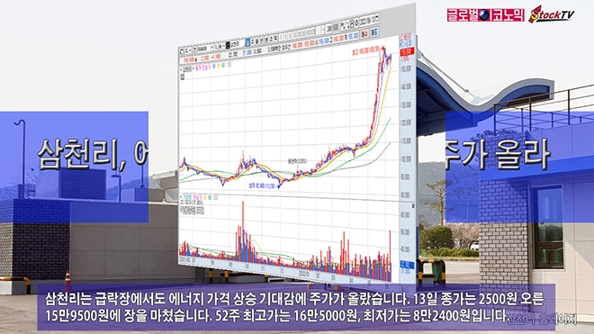 삼천리는 급락장에서도 에너지 가격 상승 기대감에 주가가 올랐습니다. 13일 종가는 2500원 오른 15만9500원에 장을 마쳤습니다. 52주 최고가는 16만5000원, 최저가는 8만2400원입니다.