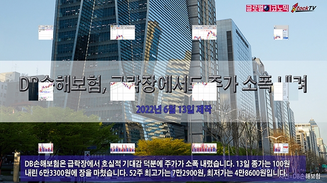 DB손해보험은 급락장에서 호실적 기대감 덕분에 주가가 소폭 내렸습니다. 13일 종가는 100원 내린 6만3300원에 장을 마쳤습니다. 52주 최고가는 7만2900원, 최저가는 4만8600원입니다.