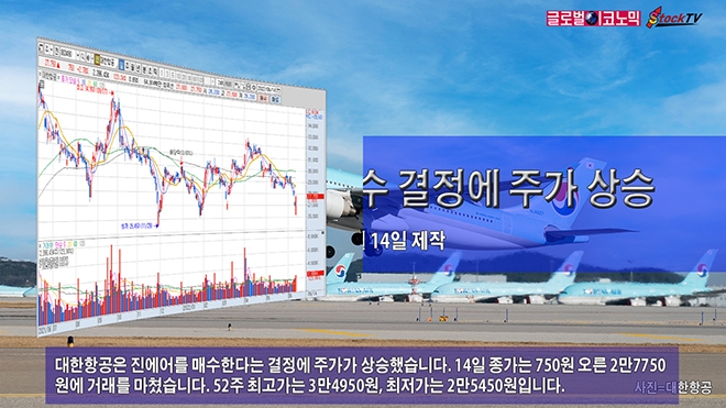대한항공은 진에어를 매수한다는 결정에 주가가 상승했습니다. 14일 종가는 750원 오른 2만7750원에 거래를 마쳤습니다. 52주 최고가는 3만4950원, 최저가는 2만5450원입니다.
