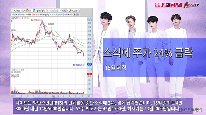 하이브는 방탄소년단(BTS)의 단체활동 중단 소식에 24% 넘게 급락했습니다. 15일 종가는 4만8000원 내린 14만5000원입니다. 52주 최고가는 42만1500원, 최저가는 13만9000원입니다.