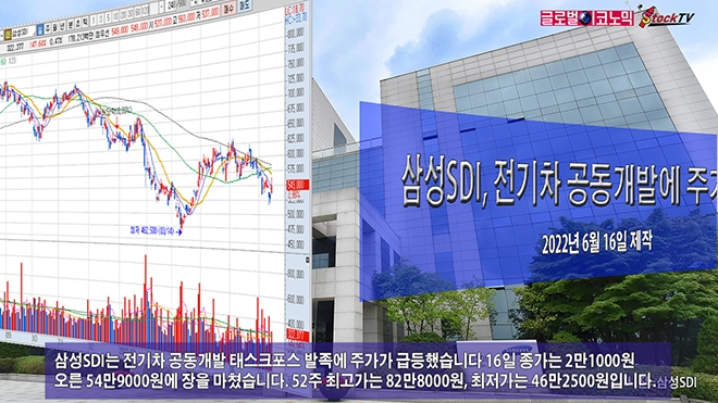 삼성SDI는 전기차 공동개발 태스크포스 발족에 주가가 급등했습니다 16일 종가는 2만1000원 오른 54만9000원에 장을 마쳤습니다. 52주 최고가는 82만8000원, 최저가는 46만2500원입니다.