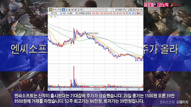 엔씨소프트는 신작이 출시된다는 기대감에 주가가 상승했습니다. 20일 종가는 1500원 오른 39만9500원에 거래를 마쳤습니다. 52주 최고가는 86만원, 최저가는 39만원입니다.