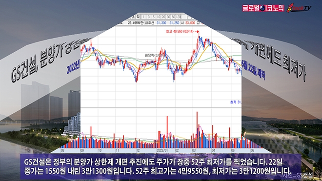 GS건설은 정부의 분양가 상한제 개편 추진에도 주가가 장중 52주 최저가를 찍었습니다. 22일 종가는 1550원 내린 3만1300원입니다. 52주 최고가는 4만9550원, 최저가는 3만1200원입니다.