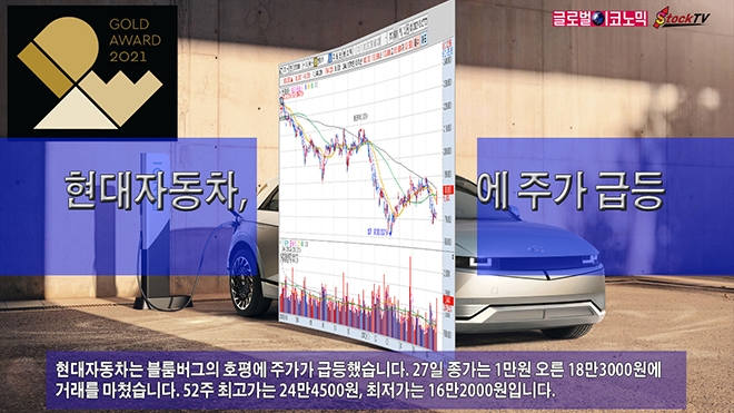 현대자동차는 블룸버그의 호평에 주가가 급등했습니다. 27일 종가는 1만원 오른 18만3000원에 거래를 마쳤습니다. 52주 최고가는 24만4500원, 최저가는 16만2000원입니다.