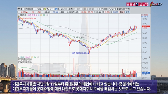 롯데지주는 기관이 한달 보름여 주식을 사들이면서 오름세가 계속되고 있습니다. 27일 종가는 450원 오른 3만6850원에 장을 마쳤습니다. 52주 최고가는 4만400원, 최저가는 2만5600원입니다.