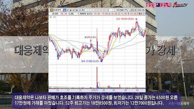 대웅제약은 나보타 판매가 호조를 기록하자 주가가 강세를 보였습니다. 28일 종가는 6500원 오른 17만원에 거래를 마쳤습니다. 52주 최고가는 18만8500원, 최저가는 12만7000원입니다.