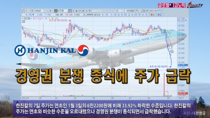 한진칼의 7일 주가는 연초인 1월 3일의 6만2200원에 비해 33.92% 하락한 수준입니다. 한진칼의 주가는 연초와 비슷한 수준을 오르내렸으나 경영권 분쟁이 종식되면서 급락했습니다.