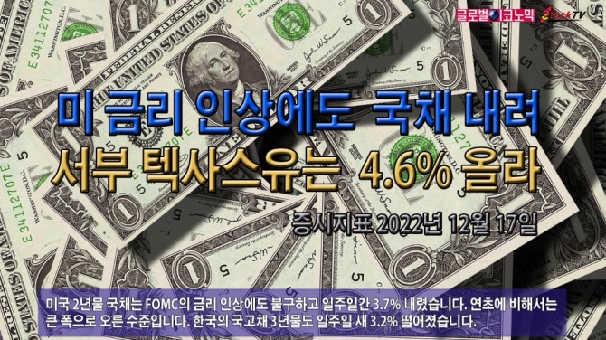 미국 2년물 국채는 FOMC의 금리 인상에도 불구하고 일주일간 3.7% 내렸습니다. 연초에 비해서는 큰 폭으로 오른 수준입니다. 한국의 국고채 3년물도 일주일 새 3.2% 떨어졌습니다.