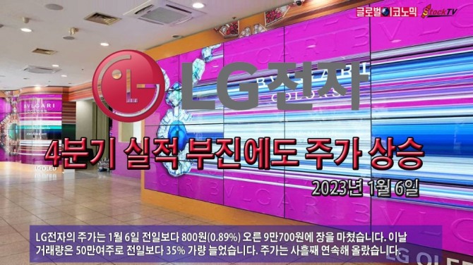 LG전자의 주가는 1월 6일 전일보다 800원(0.89%) 오른 9만700원에 장을 마쳤습니다. 이날 거래량은 50만여주로 전일보다 35% 가량 늘었습니다. 주가는 사흘째 연속해 올랐습니다.