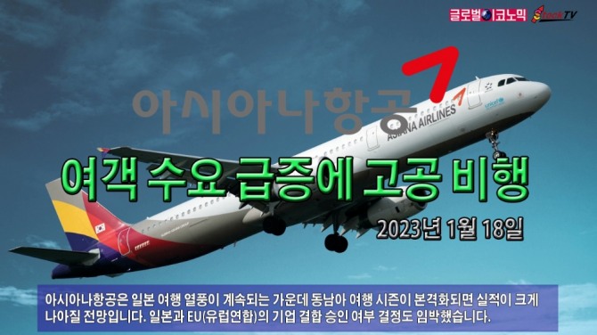 아시아나항공은 일본 여행 열풍이 계속되는 가운데 동남아 여행 시즌이 본격화되면 실적이 크게 나아질 전망입니다. 일본과 EU(유럽연합)의 기업 결합 승인 여부 결정도 임박했습니다.
