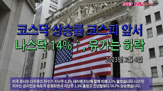 미국 증시는 다우존스 지수가 지난주 0.2% 내리며 지난해 말에 비해 2.3% 올랐습니다. 나스닥 지수는 금리인상 속도가 둔화되면서 지난주 3.3% 올랐고 전년말보다 14.7% 상승했습니다.