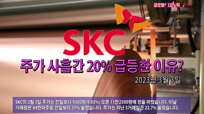 SKC의 3월 3일 주가는 전일보다 9300원(9.03%) 오른 11만2300원에 장을 마쳤습니다. 이날 거래량은 84만여주로 전일보다 37% 늘었습니다. 주가는 지난 3거래일간 22.7% 올랐습니다.