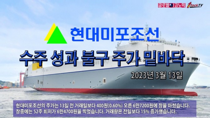 현대미포조선의 주가는 13일 전 거래일보다 400원(0.60%) 오른 6만7200원에 장을 마쳤습니다. 장중에는 52주 최저가 6만4700원을 찍었습니다. 거래량은 전일보다 15% 증가했습니다.