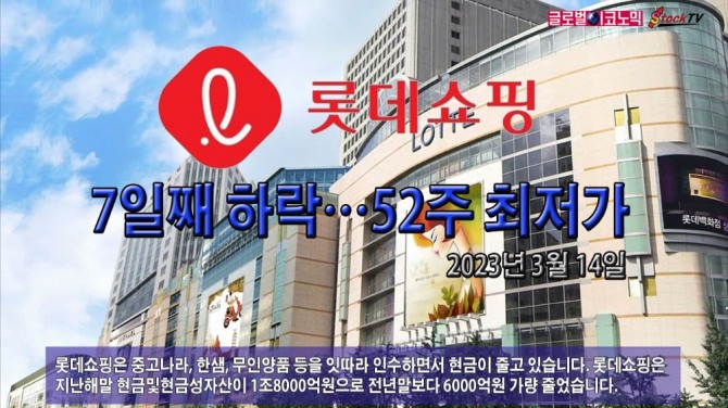 롯데쇼핑의 3월 14일 주가는 지난해 말의 9만1000원에 비해 12.75% 하락한 수준입니다. 같은 기간 코스피 지수가 5.03% 상승한데 비하면 롯데쇼핑의 주가는 역주행하고 있습니다.