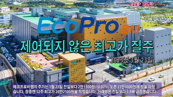 에코프로비엠의 주가는 3월 23일 전일보다 2만1500원(10.07%) 오른 23만5000원에 장을 마쳤습니다. 장중엔 52주 최고가 26만2500원을 찍었습니다. 거래량은 전일보다 3.4배 급증했습니다.
