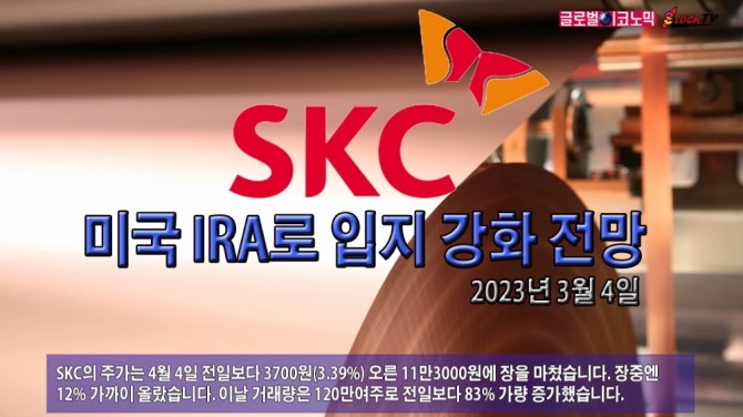 SKC의 주가는 4월 4일 전일보다 3700원(3.39%) 오른 11만3000원에 장을 마쳤습니다. 장중엔 12% 가까이 올랐습니다. 이날 거래량은 120만여주로 전일보다 83% 가량 증가했습니다.