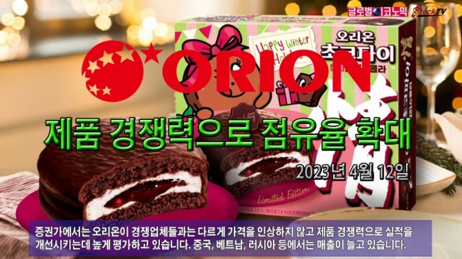 증권가에서는 오리온이 경쟁업체들과는 다르게 가격을 인상하지 않고 제품 경쟁력으로 실적을 개선시키는데 높게 평가하고 있습니다. 중국, 베트남, 러시아 등에서는 매출이 늘고 있습니다.