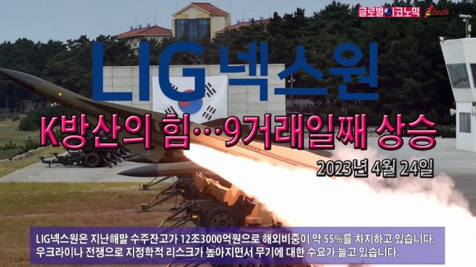 LIG넥스원은 지난해말 수주잔고가 12조3000억원으로 해외비중이 약 55%를 차지하고 있습니다. 우크라이나 전쟁으로 지정학적 리스크가 높아지면서 무기에 대한 수요가 늘고 있습니다.