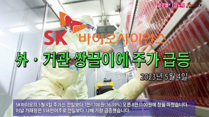 SK바이오의 5월 4일 주가는 전일보다 1만1700원(16.39%) 오른 8만3100원에 장을 마쳤습니다. 이날 거래량은 358만여주로 전일보다 12배 가량 급증했습니다.