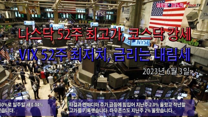 미국 나스닥은 부채한도 협상 타결과 엔비디아 주가 급등에 힘입어 지난주 2.0% 올랐고 작년말보다 26.5% 상승하며 52주 최고가를 기록했습니다. 다우존스도 지난주 2% 올랐습니다.
