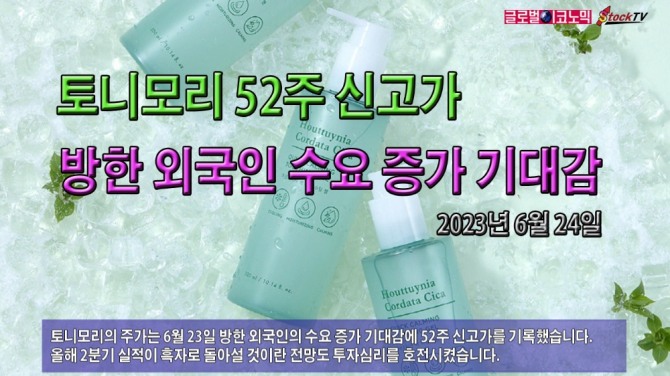 토니모리의 주가는 23일 전일보다 760원(13.72%) 오른 6300원에 장을 마쳤습니다. 장중엔 52주 최고가 6340원을 찍었습니다. 이날 거래량은 189만여주로 전일보다 7.9배 급증했습니다.