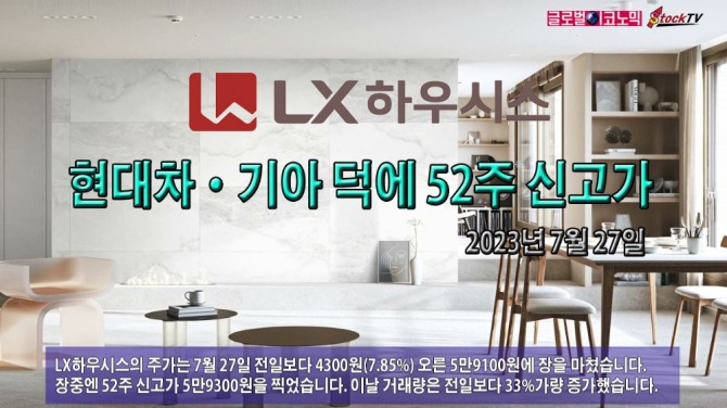 LX하우시스의 주가는 7월 27일 전일보다 4300원(7.85%) 오른 5만9100원에 장을 마쳤습니다. 장중엔 52주 신고가 5만9300원을 찍었습니다. 이날 거래량은 전일보다 33%가량 증가했습니다.