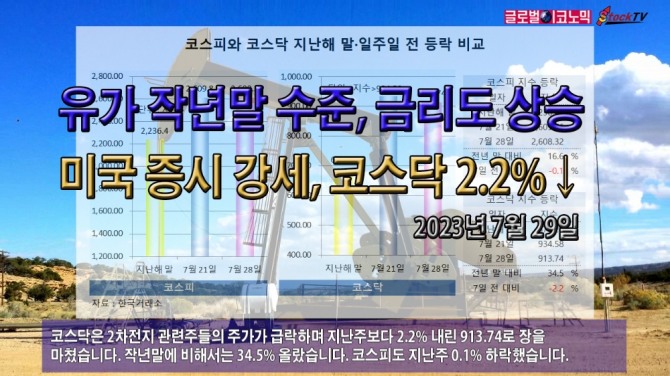 코스닥은 2차전지 관련주들의 주가가 급락하며 지난주보다 2.2% 내린 913.74로 장을 마쳤습니다. 작년말에 비해서는 34.5% 올랐습니다. 코스피도 지난주 0.1% 하락했습니다.