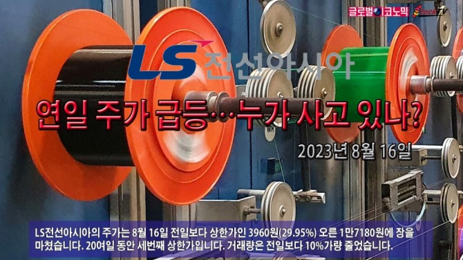 LS전선아시아의 주가는 8월 16일 전일보다 상한가인 3960원(29.95%) 오른 1만7180원에 장을 마쳤습니다. 20여일 동안 세번째 상한가입니다. 거래량은 전일보다 10%가량 줄었습니다.
