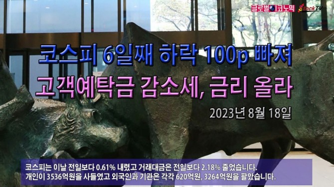 코스피는 이날 전일보다 0.61% 내렸고 거래대금은 전일보다 2.18% 줄었습니다. 개인이 3536억원을 사들였고 외국인과 기관은 각각 620억원, 3264억원을 팔았습니다.