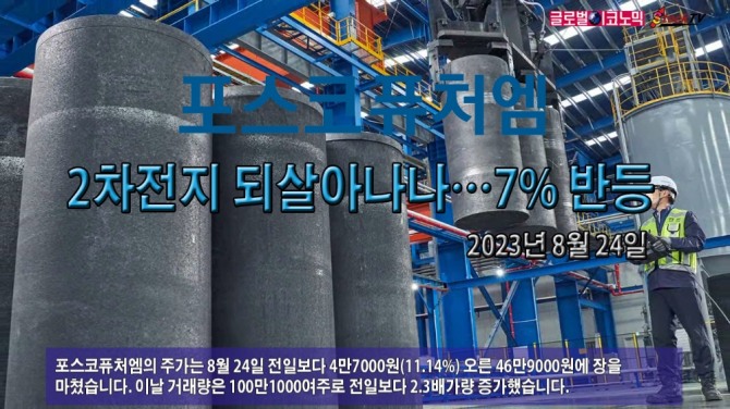 포스코퓨처엠의 주가는 8월 24일 전일보다 4만7000원(11.14%) 오른 46만9000원에 장을 마쳤습니다. 이날 거래량은 100만1000여주로 전일보다 2.3배가량 증가했습니다.