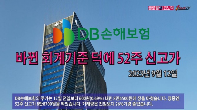 DB손해보험의 주가는 12일 전일보다 600원(0.69%) 내린 8만6500원에 장을 마쳤습니다. 장중엔 52주 신고가 8만8700원을 찍었습니다. 거래량은 전일보다 26%가량 줄었습니다.